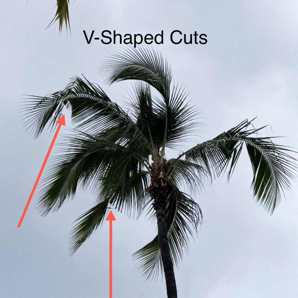 While V-shaped cuts are one of the easiest signs to recognize, there are several other indicators that a palm tree may have been attacked by CRB.